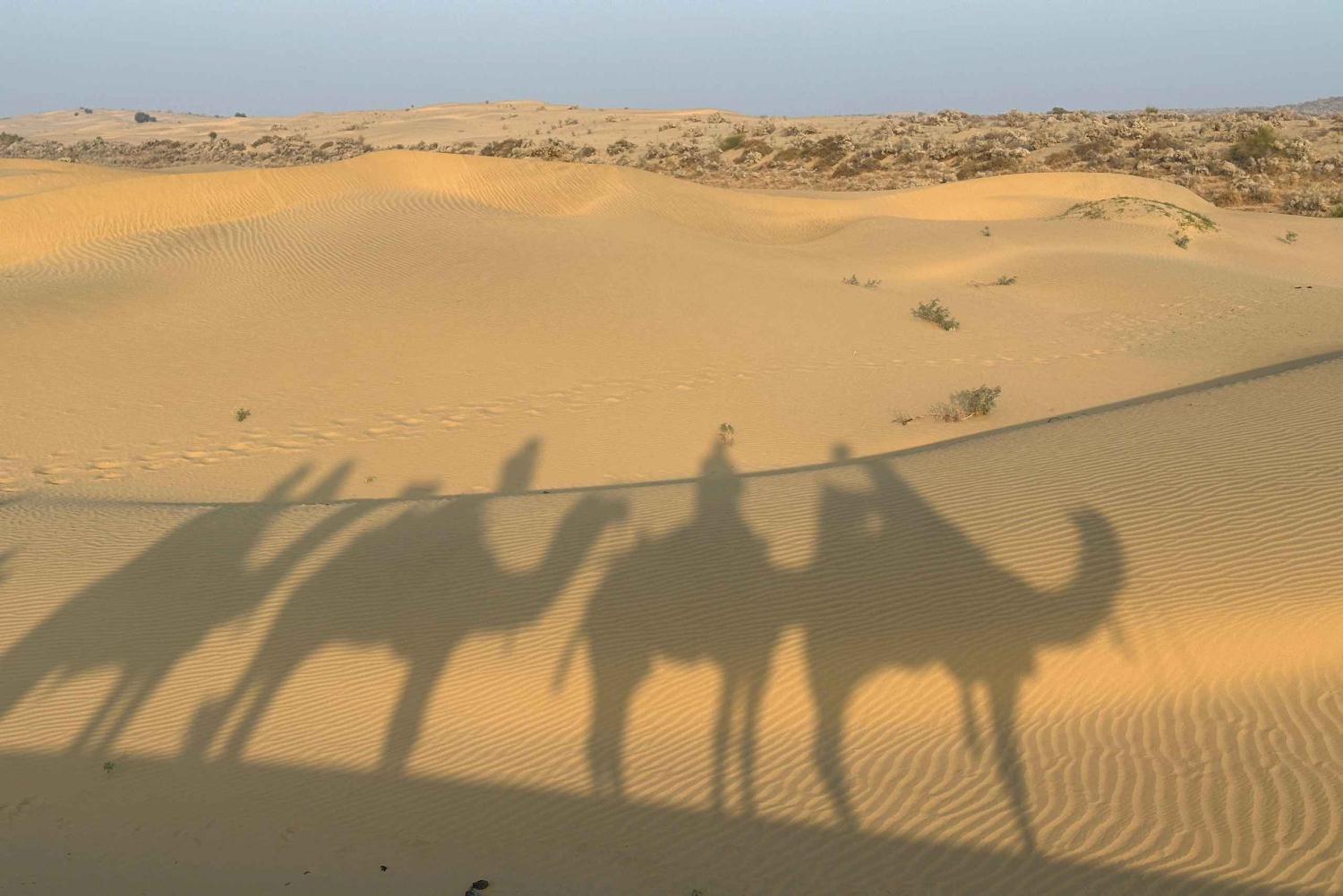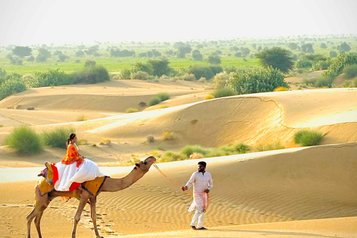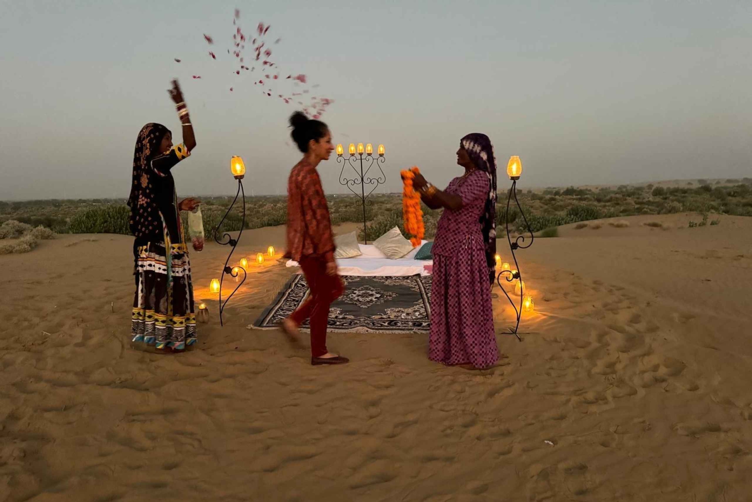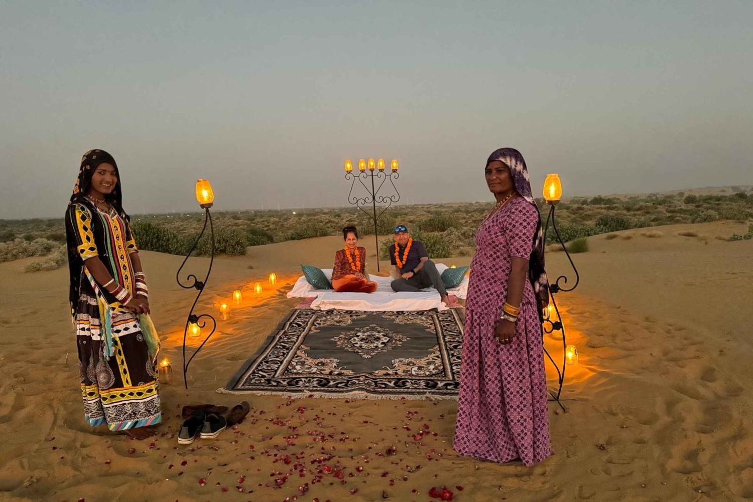 Dining on the sand dunes under the star-lit night sky is an experience you'll cherish for a lifetime. To make things better, we have an 'à la carte' menu to ensure that you have a pleasant dining affair. This tour has been designated to offer a sweet yet adventurous experience that includes transfer to & from Jaisalmer, a captivating camel ride into the dunes where you will be in for enchanting sunset and an unforgettable romantic candle-light dining experience under the stars with a backdrop of a Cultural dance & music performance. On the way to dunes, you will be visiting Khaba and a natural oasis. Later, you will head back to Jaisalmer after having a scrumptious dinner together. The dinner on dunes experience starts around 04:00 PM in the evening and ends at around 10:00 PM, same day. Dinner on Dunes Safari departs at around 4 PM From Jaisalmer by Jeep. Way to dunes you'll visit Khaba Fort and Natural Oasis after that you'll go for a Camel Ride for 45 minutes in Desert, then you'll enjoy the beautiful sunset after that you'll fell in love with cultural dance and music program soon followed by a wine and a delicious candle light dinner after that you can Stargaze for while and will be back at Jaisalmer till 10:00 PM.Includes
