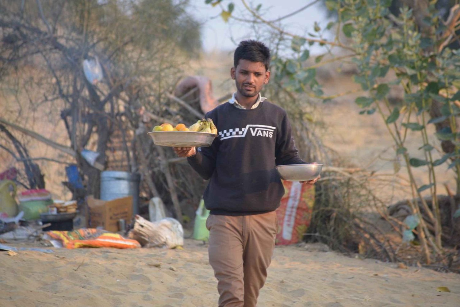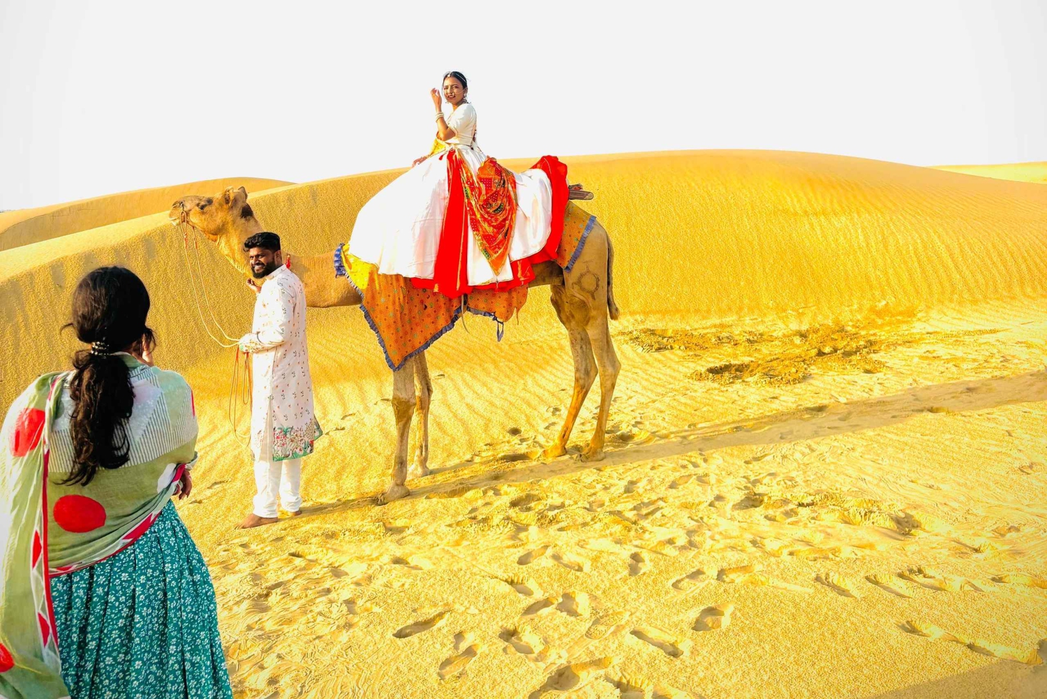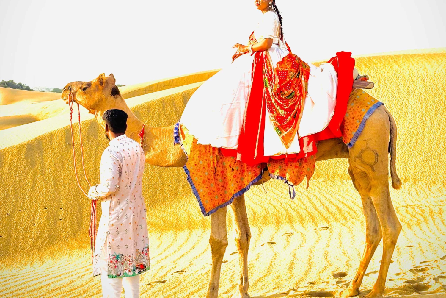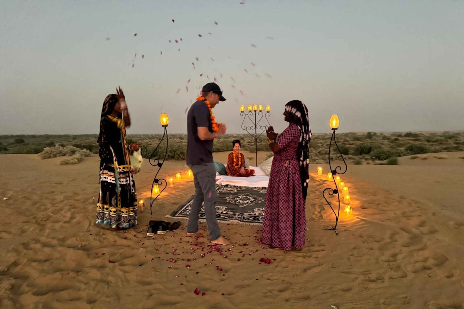 Dining on the sand dunes under the star-lit night sky is an experience you'll cherish for a lifetime. To make things better, we have an 'à la carte' menu to ensure that you have a pleasant dining affair. This tour has been designated to offer a sweet yet adventurous experience that includes transfer to & from Jaisalmer, a captivating camel ride into the dunes where you will be in for enchanting sunset and an unforgettable romantic candle-light dining experience under the stars with a backdrop of a Cultural dance & music performance. On the way to dunes, you will be visiting Khaba and a natural oasis. Later, you will head back to Jaisalmer after having a scrumptious dinner together. The dinner on dunes experience starts around 04:00 PM in the evening and ends at around 10:00 PM, same day. Dinner on Dunes Safari departs at around 4 PM From Jaisalmer by Jeep. Way to dunes you'll visit Khaba Fort and Natural Oasis after that you'll go for a Camel Ride for 45 minutes in Desert, then you'll enjoy the beautiful sunset after that you'll fell in love with cultural dance and music program soon followed by a wine and a delicious candle light dinner after that you can Stargaze for while and will be back at Jaisalmer till 10:00 PM.Includes