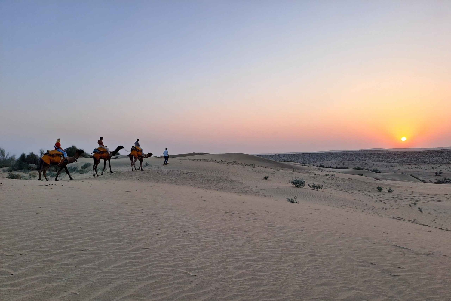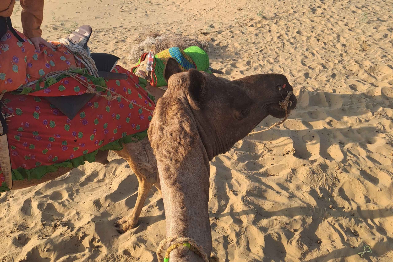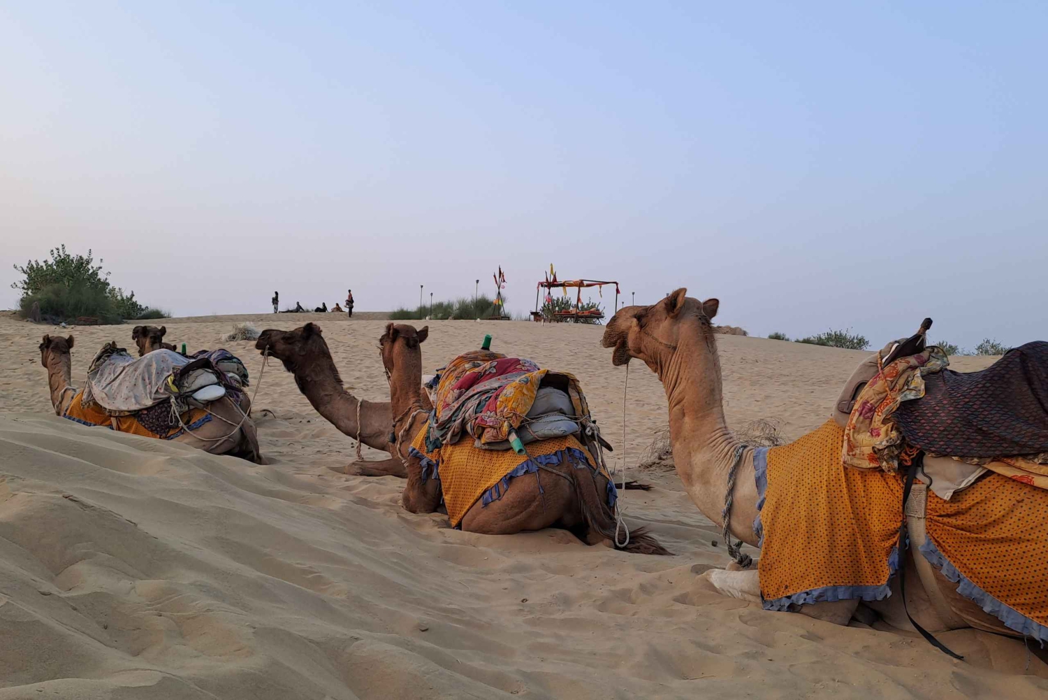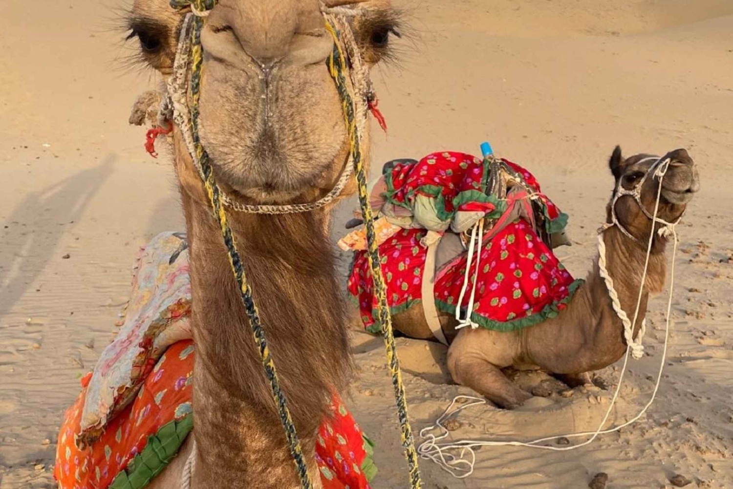 Il tuo tour inizierà quando verrai prelevato dal tuo hotel a Jaisalmer nel pomeriggio e guidato fino alle Dune di Sabbia. Durante il tragitto esploreremo il villaggio di Kuldhara (abbandonato) e il lago dell'oasi. Una volta arrivato nel deserto, inizierai un giro in cammello, visitando alcuni villaggi caratteristici lungo il percorso e arrivando alle dune di sabbia giusto in tempo per il tramonto. Dopo aver provato alcune impressioni del deserto, godrai di una deliziosa cena rajasthani e di danze e musiche popolari rajasthani in un resort di lusso nel deserto. Poi tornerai a Jaisalmer.Includes