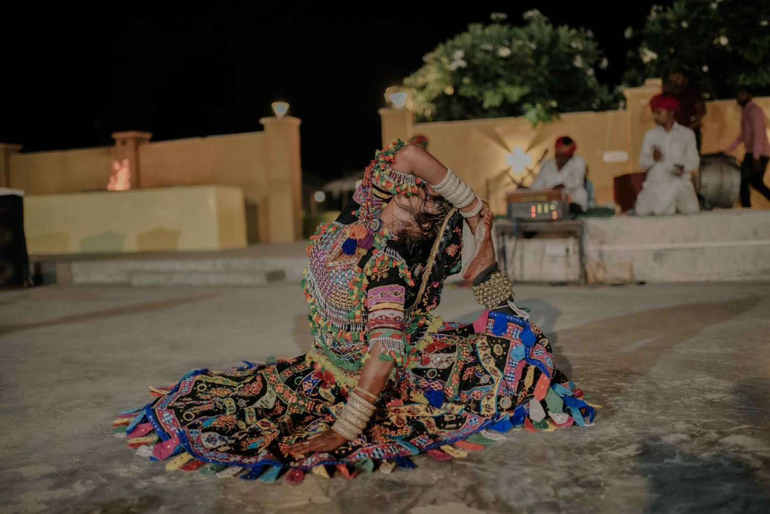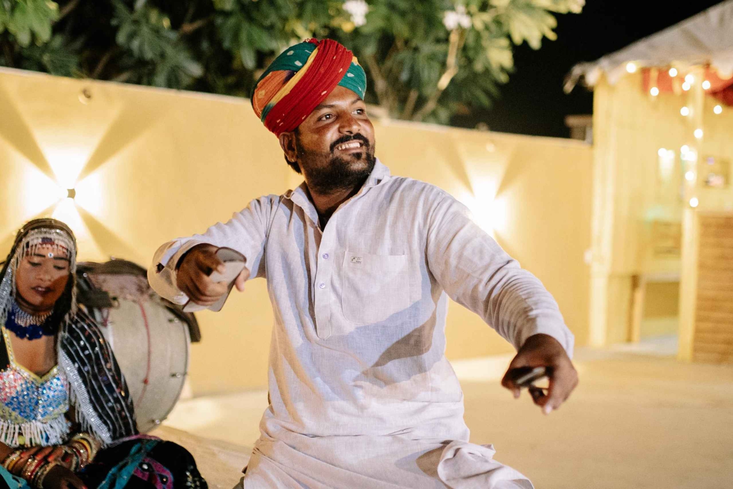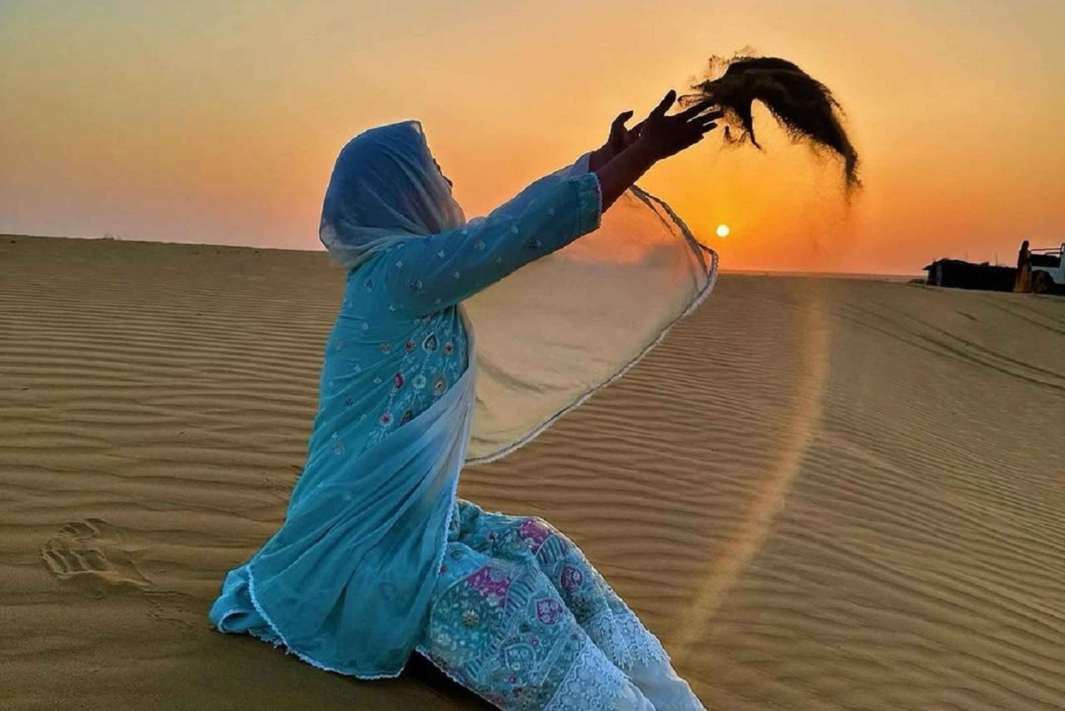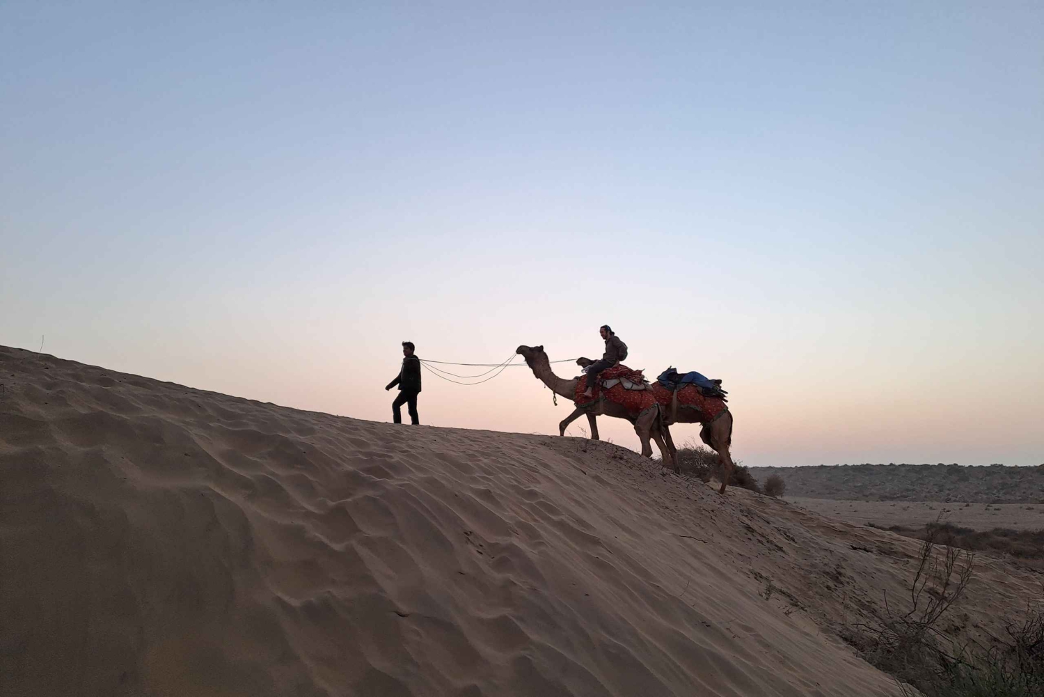 Il tuo tour inizierà quando verrai prelevato dal tuo hotel a Jaisalmer nel pomeriggio e guidato fino alle Dune di Sabbia. Durante il tragitto esploreremo il villaggio di Kuldhara (abbandonato) e il lago dell'oasi. Una volta arrivato nel deserto, inizierai un giro in cammello, visitando alcuni villaggi caratteristici lungo il percorso e arrivando alle dune di sabbia giusto in tempo per il tramonto. Dopo aver provato alcune impressioni del deserto, godrai di una deliziosa cena rajasthani e di danze e musiche popolari rajasthani in un resort di lusso nel deserto. Poi tornerai a Jaisalmer.Includes