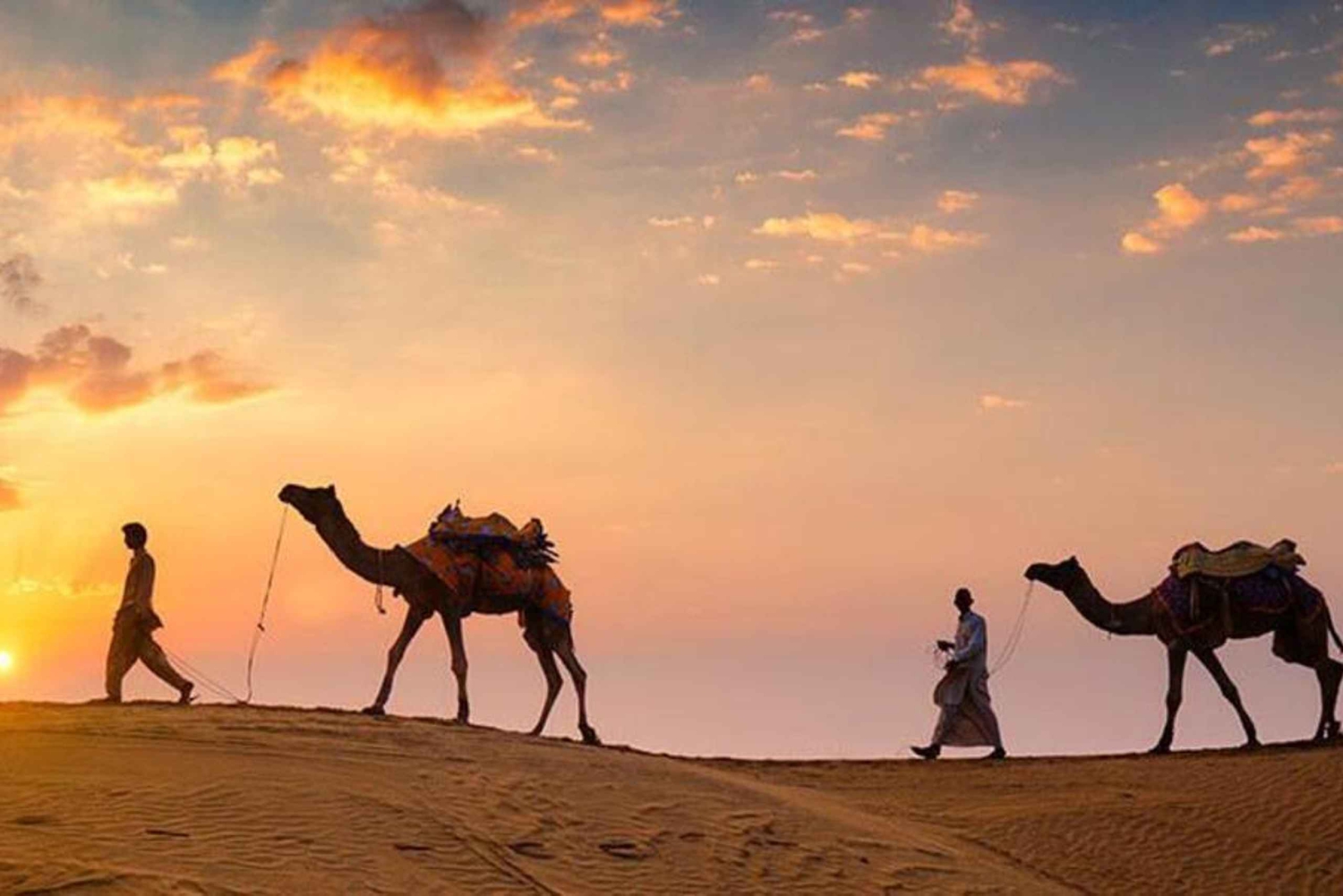 ジョードプルからの 2 日間のツアーで、黄金の都ジャイサルメールとクッリ砂漠を探索しましょう。メヘラーンガル城、ジャイサルメール城、そして華やかな王宮を訪れます。