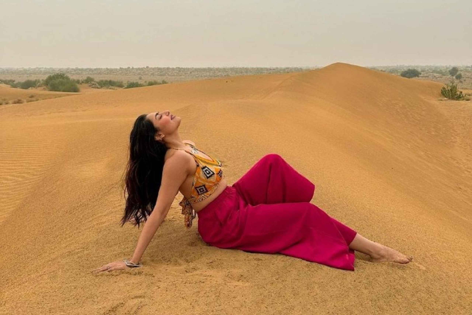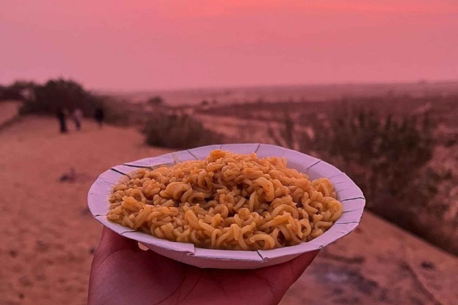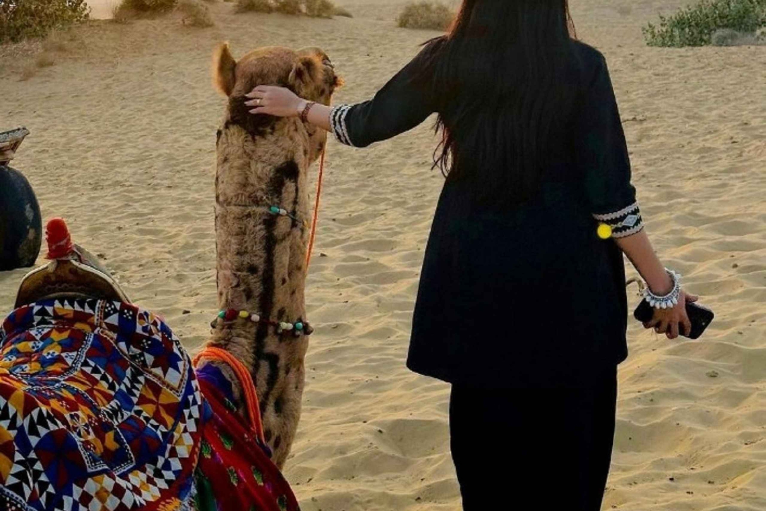 あなたの冒険は午後 2 時 30 分にジャイサルメールのホテルへのお迎えで始まります まで車で移動、発見まで 1 時間 20 分です。砂丘に向かう途中で、クルダラ放棄村、カバ MT フォート、自然のオアシスを訪れます。 フレンドリーなガイドと健康なラクダが温かく迎えてくれます。 • ラクダに乗って砂漠まで約45分間お楽しみください。その後、4x4ジープ・サファリ・デューンズ・バッシングを開いてください。 • 砂丘に立ち寄り、美しい夕日を眺め、紅茶やコーヒーとともにおいしい軽食を味わいましょう。 • フレンドリーなラクダの運転手が薪の火で調理したおいしいディナー。 • その後、たき火の周りに座って、伝統的な本格的なおいしい野菜をお召し上がりください。夕食。 ジープに乗ってホテルのバック ジャイサルメール ドロップまで行き、午後 10 時までに到着します。 *Rumiチームとのツアーの永遠の思い出とともにツアーは終了します 注: 予約時に簡単に受け取りできるよう、正確な受け取り場所の詳細をお知らせください。Includes