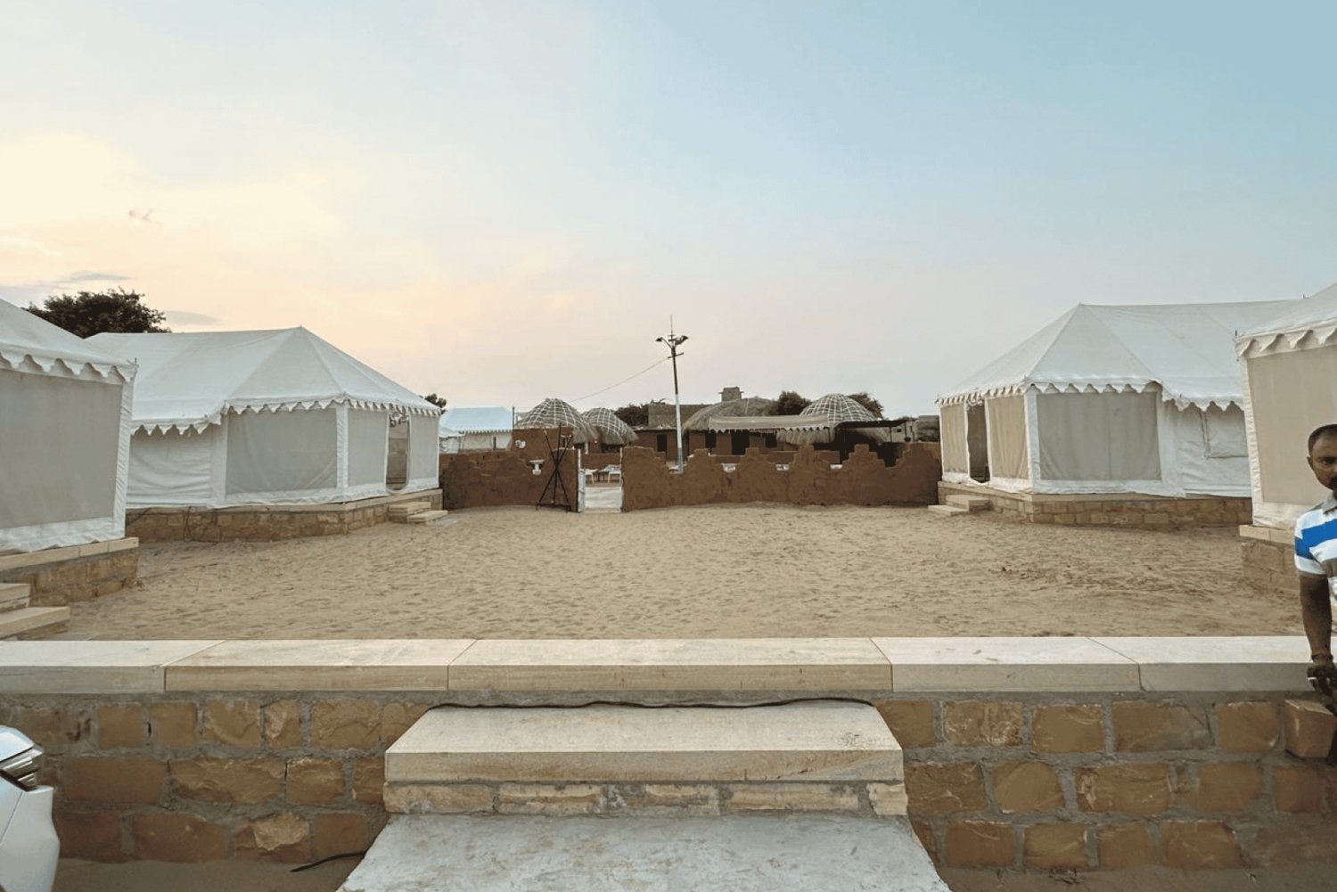 Begin je avontuur met een ophaalservice vanaf je hotel of het treinstation van Jaisalmer. Ga naar het fort van Jaisalmer, een van de weinige 'levende forten' ter wereld. Verken het complex van zeven onderling verbonden jain-tempels, bekend om hun prachtige architectuur en gedetailleerde gravures in gele zandsteen. Bewonder vervolgens de prachtige Patwon Ki Haveli, een cluster van vijf grote haveli's die getuigen van verfijnd vakmanschap en historische betekenis. Ga verder naar het Gadisar-meer voordat je naar Khuri rijdt, ongeveer 50 km van Jaisalmer. Kom aan in het woestijnkamp en geniet van een welkomstdrankje. Ga op een kamelensafari door de duinen tijdens zonsondergang. Keer terug naar het kamp voor thee en snacks en woon daarna een live Rajasthani-cultuurshow bij met volksdansen en muziek. Geniet van een traditioneel Rajasthani-buffetdiner voordat je de nacht doorbrengt in een tent met eigen badkamer. Ga op de tweede dag bij zonsopgang op een jeepsafari. Geniet van het ontbijt in het kamp voordat je wordt teruggebracht naar de stad Jaisalmer of het treinstation.Includes