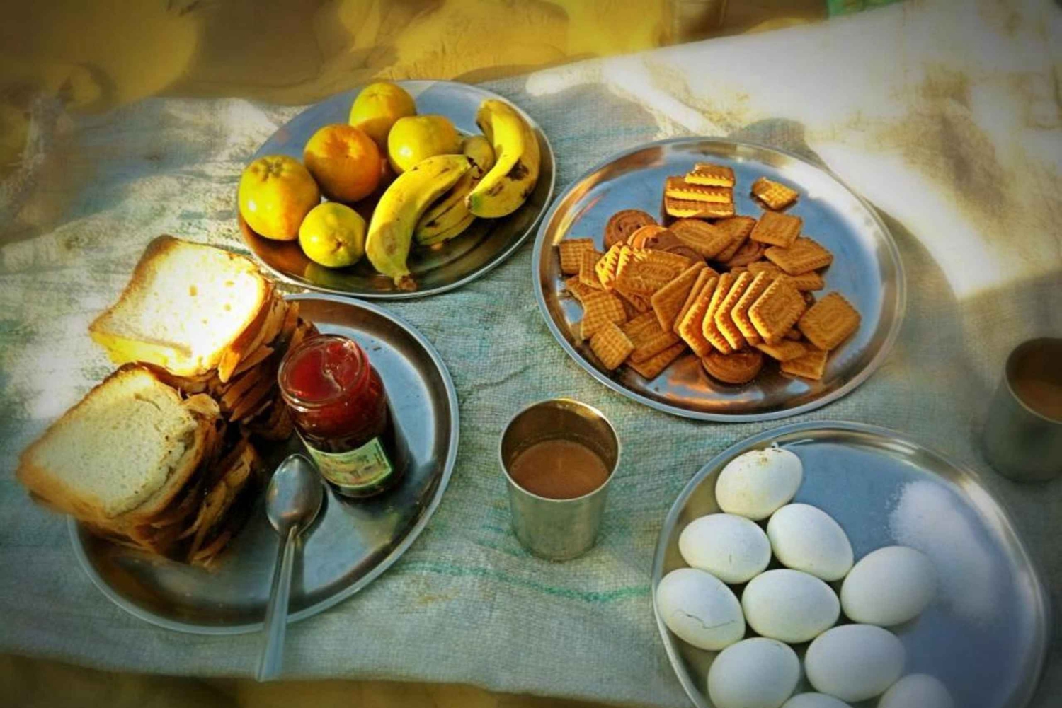 Откройте для себя великолепные просторы пустыни Тар в этом однодневном туре из Джайсалмера. Прокатитесь по песчаным дюнам, поужинайте у костра и полюбуйтесь восходом солнца над песками. Маршрут: День 1: Джайсалмер — пустыня Тар • Верблюжье сафари начинается около 14:00 от офиса Marvin Camel Safari на джипе или автомобиле. • По дороге к дюнам вы посетите природный оазис и форт Кхабха МТ. • По прибытии в пустыню вас радушно встретят дружелюбные погонщики верблюдов и здоровые верблюды. • Насладитесь верблюжьей прогулкой по пустыне продолжительностью около 30-45 минут. • Остановитесь на дюнах, полюбуйтесь прекрасным закатом и насладитесь вкусными закусками с чаем. • Вкусный ужин, приготовленный на дровах вашим дружелюбным верблюжьим погонщиком. • Позже, посидите у костра и попробуйте вкусный традиционный вегетарианский ужин. • Насладитесь миллиардами звезд и луной в красоте пустыни Тар. • Спите под звездами в теплых постельных принадлежностях в пустынном стиле или на дюнах, любуясь звездным небом. День 2: Пустыня Тар - Джайсалмер • На следующее утро проснитесь под прекрасный восход солнца с чашкой чая. • После восхода солнца съешьте здоровый завтрак. • Сядьте на верблюда и прокатитесь около 30 минут. • Поезжайте на джипе или автомобиле в Джайсалмер и прибудете к 10 утра. *Тур заканчивается вечными воспоминаниями о вашем туре с Marvin Camel Safari*. Примечание: пожалуйста, укажите точное место встречи для удобства трансфера во время бронирования. Обед не включен в этот тур. Костёр или костёр только в зимнее время из соображений безопасности.Includes