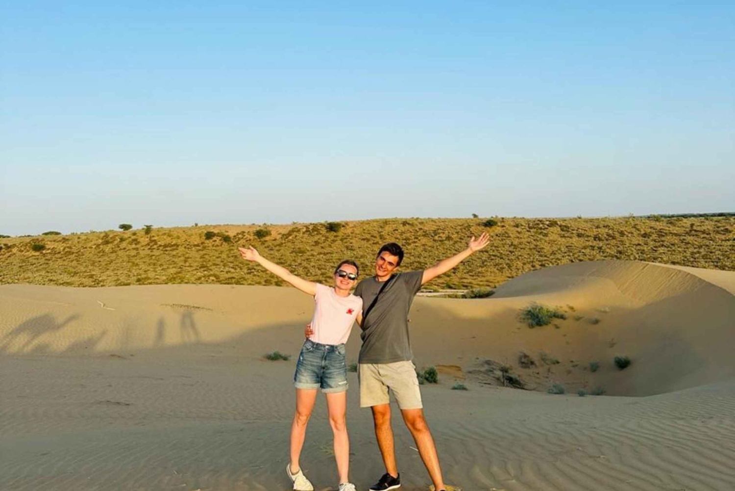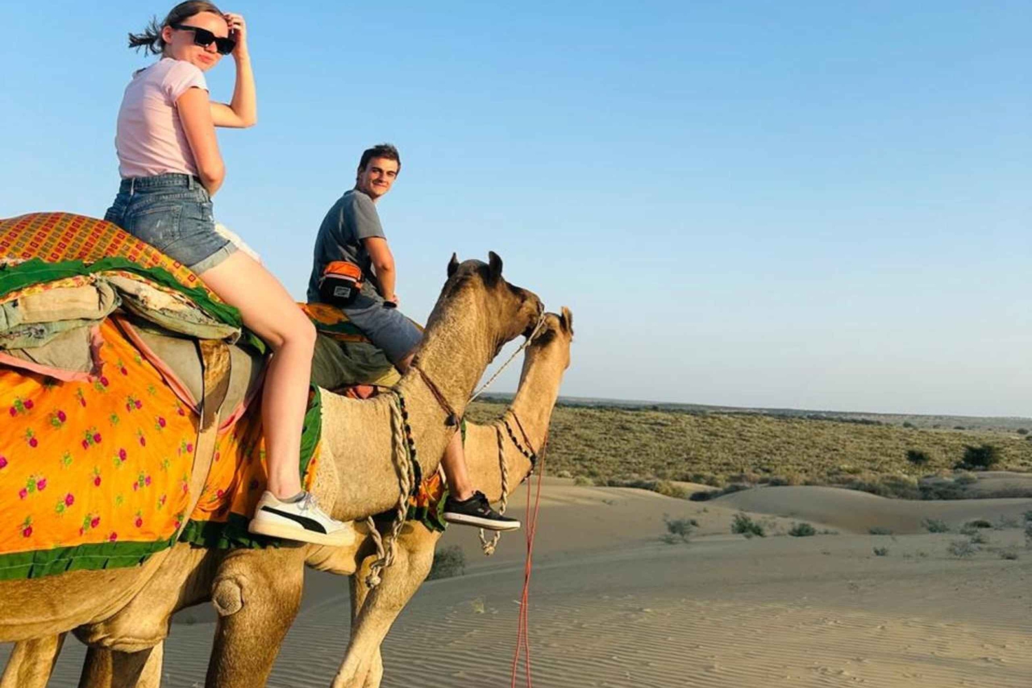Börja din resa med ett varmt välkomnande och en kort biltur in i öknen. Njut av en kamelsafari över de böljande sanddynerna, följt av en jeeptur för en adrenalinkick. Besök små ökenbyar för att träffa lokala familjer, lära dig om deras traditioner och uppleva enkelheten i ökenlivet. När solen går ner, koppla av med chai och se öknen bli gyllene. Njut av en nykokt Rajasthani-middag vid lägerelden. Höjdpunkten på resan är att sova i den öppna öknen, under den fantastiska stjärnfyllda himlen – inga tält, inget stadsbuller, bara dynernas tystnad. Vakna upp till en magisk soluppgång över öknen, följt av en lätt frukost innan du återvänder.Includes